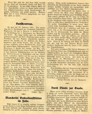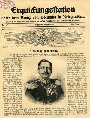 Missionsblatt "Erquickungsstation unter dem Kreuz von Golgatha in Kriegsnöten. Zugleich ein Gruß aus der Heimat an unsere kämpfenden und verwundeten Soldaten"; 4-blättriges Missionsblatt der Evangelischen Vereinsbuchhandlung Kaiserslautern (25. Juni 1916); Schriftleitung: Professor Krafft in Kaiserslautern. Druck: Emil Rohr Buchdruckerei und Verlagsgesellschaft m.b.H., Kaiserslautern.