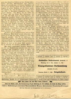 Missionsblatt "Erquickungsstation unter dem Kreuz von Golgatha in Kriegsnöten. Zugleich ein Gruß aus der Heimat an unsere kämpfenden und verwundeten Soldaten"; 4-blättriges Missionsblatt der Evangelischen Vereinsbuchhandlung Kaiserslautern (02. Juli 1916); Schriftleitung: Professor Krafft in Kaiserslautern. Druck: Emil Rohr Buchdruckerei und Verlagsgesellschaft m.b.H., Kaiserslautern.