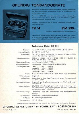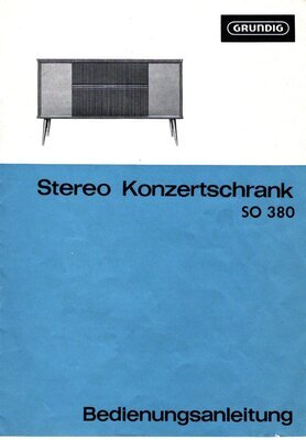 Die Bedienungsanleitung für den Grundig Konzertschrank SO 380 besteht aus 8 DIN A 5 Seiten, größtenteils im s/w Druck. Lediglich die Umschlagseite ist zu einem Teil in blauer Farbe gedruckt. Die Anleitung ist ausschließlich in deutscher Sprache, beinhaltet alle technische Daten und einen Schaltplan. Auf der Rückseite ist eine Werbung für das Grundig Tonbandgerät TK 14