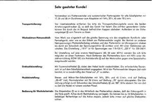 Die im DIN A 5 Querformat gedruckte Bedienungsanleitung ist für den 10er Wechsler Grundig 1008 A. Hergestellt wurde das Einbaugerät jedoch von DUAL, ebenfalls mit der Typ Nr. 1008 A. Eingebaut wurde der 10er Wechsler z Bsp. im Grundig Konzertschrank SO 380. Die Bedienungsanleitung umfasst 14 Seiten und ist außer in Deutsch noch in Englisch, Französisch und Spanisch gedruckt. Der Plattenspieler kann Schallplatten mit 16, 33 45 und 78 U/min abspielen.