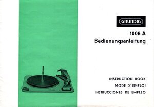 Die im DIN A 5 Querformat gedruckte Bedienungsanleitung ist für den 10er Wechsler Grundig 1008 A. Hergestellt wurde das Einbaugerät jedoch von DUAL, ebenfalls mit der Typ Nr. 1008 A. Eingebaut wurde der 10er Wechsler z Bsp. im Grundig Konzertschrank SO 380. Die Bedienungsanleitung umfasst 14 Seiten und ist außer in Deutsch noch in Englisch, Französisch und Spanisch gedruckt. Der Plattenspieler kann Schallplatten mit 16, 33 45 und 78 U/min abspielen.