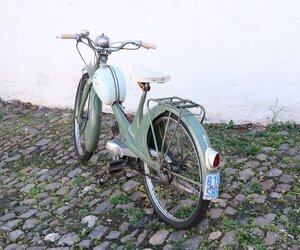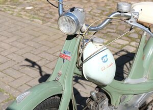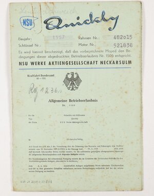 Unser Moped –oder wie es im Amtsdeutsch heißt „Fahrrad mit Hilfsmotor“ - ist eine NSU Quickly. 1957 von NSU in Neckarsulm gebaut, erfreute sich das Moped großer Beliebtheit. Mit einem Ladenpreis von 525 DM war es damals, auch für weniger betuchte Kunden, erschwinglich. Immerhin wurden ca. 300.000 Stück verkauft. Der NSU Zweitakter hatte einen Hubraum von 49 ccm und leistete 1,3 PS. Der Normverbrauch lag, lt. Werk, bei 1,3 ltr/100 km, Benzin/Öl Gemisch, was bei einem Tankinhalt von 3 ltr, für ca. 230 km reichte. Das Moped hat 2 Gänge, die über einen Drehgriff am Lenker geschaltet wurden. Die Höchstgeschwindigkeit war mit 40 km/h angegeben. Der km Zähler im Tacho (beides im Scheinwerfer integriert) zeigt eine Gesamtfahrleistung von nur 7.243 km aus. Das Moped ist heute noch fahrtüchtig. Zu unserem Moped gibt es noch die Original Zulassung, aus der hervorgeht, dass der Verkäufer damals, die Firma Alfred Lentes, NSU Händler aus Schweich, war. Die Zulassung und die Werbebroschüre befinden sich un unserem Archiv.