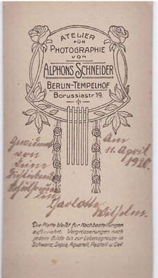 Zu sehen ist ein Mädchen im Atelier. Sie trägt ein durchgehend weißes Kleid, welches im unteren Teil durch stärkere weiße Streifen verziert wird. In der linken Hand hält sie ein Gebetsbuch und einen Rosenkranz. In der rechten Rand hält sie ihre Kommunionskerze, welche sie auf ein kleines Tischchen stützt. Eine große Schleife um die Kerze dient aus Tropfenfänger. Am unteren Ende ist die Kerze mit kleinen Blumengirlanden geschmückt. Oben auf dem Kopf trägt das Kind eine große, weiße Schleife. Im Nacken ist ebenfalls eine Schleife sichtbar. Diese ist wohl auch am Haar befestigt.