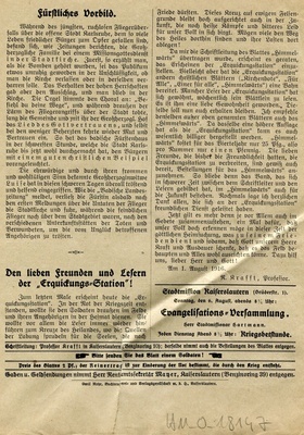 Missionsblatt "Erquickungsstation unter dem Kreuz von Golgatha in Kriegsnöten. Zugleich ein Gruß aus der Heimat an unsere kämpfenden und verwundeten Soldaten"; 4-blättriges Missionsblatt der Evangelischen Vereinsbuchhandlung Kaiserslautern (06. August 1916); Schriftleitung: Professor Krafft in Kaiserslautern. Druck: Emil Rohr Buchdruckerei und Verlagsgesellschaft m.b.H., Kaiserslautern;