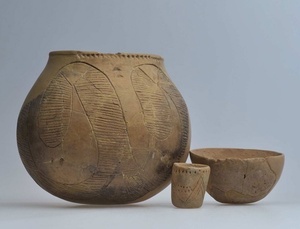 Tongefäße der bandkeramischen Kultur, der ersten Phase der Jungsteinzeit ab ca. 5200 v. Chr. auch in der Moselregion, sind in der Regel rundbodig, glattwandig und oft mit Spiral- oder Zickzackbändern verziert. Der miniaturhaftige steilwandige und flachbodige Becher (vorne rechts) stellt eher ein singuläres Stück oder Kinderspielzeug dar. Die erste Keramik wurde noch ohne Töpferscheibe geformt. Die in den noch weichen Ton eingeritzten oder eingestochenen Verzierungen waren ursprünglich mit roter oder weißer Farbe ausgefüllt. Die Bandkeramiker waren die ersten sesshaften Bauern und Viehzüchter, die ausgehend von den großen Flusstälern die fruchtbaren Böden im gesamten Mitteleuropa südlich der "Lößgrenze" besiedelten. Sie bewohnten aus Holz und Lehm gebaute Langhäuser.
