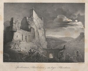 Lithografie der Burgruine Sperberstein (Bärbelstein) vom deutschen Maler Heinrich Jakob Fried. Der Titel "Sperberstein (Bärbelstein) im bayer. Rheinkreise" steht in Schreibschrift unterhalb des Bildmotivs. In der linken Ecke unterhalb des Bildes sind die Angaben zum Künstler "Nach der Natur u. auf Stein gez. v. Fried" und rechts gegenüber "Gedr. v. L. Lacroix" für die Steindruckerei von Joseph Lacroix aus München. Der eigentliche Name der Burg ist Burg Berwartstein. Die Grafik stammt aus einer Sammlung Pfälzer Ansichten die unter dem Titel "Erinnerung an die Vorzeit. Die Rheinpfalz. Ansichten ihrer Denkmale des Mittelalters als Beitrag zur Geschichte und in landschaftlichen Ansichten gesammelt von H. J. Fried." 1830 veröffentlicht wurde. Der Titel der Grafik ist in Schreibschrift in der Mitte unten. Blick von Nordwesten auf die Ruinen der Burg Berwartstein. Die Burg ist in der Lithografie links abgebildet. Unterhalb der Mauern sind drei liegende Rehe und ein stehender Hirsch. Die rechte Seite der Grafik nimmt der Blick auf die Anhöhen des Dahner Felsenlands ein. Ganz rechts am Rand ist der Turm Kleinfrankreich zu sehen. Der Himmel ist wolkenverhangen. Die Burg ist hier in ihrem Zustand von vor 1830 abgebildet. Die Höhenburg Berwartstein, auch als Bärbelstein und hier fälschlicherweise als Sperberstein bezeichnet, befindet sich auf dem Grünberg. Die erste urkundliche Erwähnung erfolgte 1152. 1591 brannte sie nieder. Nach wechselnden Eigentümern und gescheiterten Wiederaufbauplänen, gelangte sie 1893 in den Besitz von Theodor Hoffmann. Die Türme und der Großteil der Oberburg sind Neubauten aus der Zeit nach 1893. Von den historischen Mauern sind nur noch wenige erhalten. Rechts gegenüber auf einem Felsen des Nestelbergs ist der Rest des Geschützturms Kleinfrankreich zu sehen. Der Turm wurde wohl gegen Ende des 15. Jahrhunderts erbaut und gehörte zur Burg Berwartstein. [Kathrin Koch]