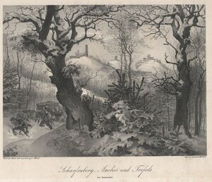 Lithografie der Burgruinen Scharfenberg, Anebos und Trifels bei Annweiler vom deutschen Maler Heinrich Jakob Fried. Der Titel "Scharfenberg, Anebos und Trifels" steht in Schreibschrift unterhalb des Bildmotivs. Der Zusatz "bei Annweiler" in Druckschrift darunter. In der linken Ecke unterhalb des Bildes sind die Angaben zum Künstler "Nach der Natur u. auf Stein gez. v. HFried" und rechts gegenüber "Gedr.v.J.Lacroix in München" für die Steindruckerei von Joseph Lacroix aus München. Die Grafik stammt aus einer Sammlung Pfälzer Ansichten die unter dem Titel "Erinnerung an die Vorzeit. Die Rheinpfalz. Ansichten ihrer Denkmale des Mittelalters als Beitrag zur Geschichte und in landschaftlichen Ansichten gesammelt von H. J. Fried." 1830 veröffentlicht wurde. Blick von Südosten aus dem Tal durch schneebedeckte Bäume auf die Burgen der Trifelsgruppe. Von links nach rechts thronen die Ruinen der Burgen Scharfenberg, Anebos und Trifels auf den Felsen. Unten links treibt ein Mann mit Peitschen zwei Pferde an, die einen schwerbeladenen Wagen durch den Schnee ziehen. Ein weiterer Mann schiebt den Wagen an. Die Burg Anebos ist eine mittelalterliche Felsenburg aus dem 13. Jahrhundert. Sie ist die jüngste der drei und befindet sich auf der mittleren der Bergkuppen des Sonnenberges. Vom ursprünglichen Bau sind nur noch sehr wenige Reste vorhanden. Die Burg Scharfenberg wird im Volksmund auch oft als „Münz“ bezeichnet, da fälschlicherweise angenommen wurde, dass sich dort die mittelalterliche Münzstätte Anweilers befunden habe. Sie wurde vor 1154 erbaut. 1525 wurde die Burg Scharfenberg im Bauernkrieg zerstört. Von Trifels aus gesehen ist sie auf dem südlichsten Berggipfel. Die Burg Trifels wurde 1081 erstmals urkundlich erwähnt. Sie diente den staufischen Königen und Kaisern als Aufbewahrungsort der Reichsinsignien und als Gefängnis für hochrangige Gefangene. Der bekannteste Inhaftierte dürfte der englische König Richard I. Löwenherz gewesen sein. 1602 wurde die Burg durch einen Blitzschlag zerstört und 1635 wurde sie aufgegeben. Die heutige Burg setzt sich aus verschiedenen Bauphasen von der Mitte des 11. Jahrhunderts bis in die 1980er zusammen. Geprägt ist die Ansicht von den Plänen Rudolf Esterers aus den 1930er Jahren, die sich deutlich vom historischen Burggebäude unterscheiden und keine Rekonstruktion des historischen Baus sind. Die Burg Trifels ist hier vor ihrer Rekonstruktion aus dem 20. Jahrhundert abgebildet. Die Trifelsgruppe befindet sich in der Nähe von Annweiler im Pfälzerwald in Rheinland-Pfalz. [Kathrin Koch]