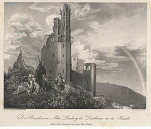 Lithografie der Ruine des Klosters Limburg vom deutschen Maler Heinrich Jakob Fried. Der Titel "Die Benediktiner_Abtei Limburg bei Dürkheim an der Haardt" steht in Schreibschrift unterhalb des Bildmotivs. Darunter steht in Druckschrift "gegründ.v.Kaiser Konrad, II. aus seiner Pfalz A° 1030." In der linken Ecke unterhalb des Bildes sind die Angaben zum Künstler "Nach der Natur u. auf Stein gez. von HFried" und rechts gegenüber "Gedr.v.J.Lacroix in München" für die Steindruckerei von Joseph Lacroix aus München. Die Grafik stammt aus einer Sammlung Pfälzer Ansichten die unter dem Titel "Erinnerung an die Vorzeit. Die Rheinpfalz. Ansichten ihrer Denkmale des Mittelalters als Beitrag zur Geschichte und in landschaftlichen Ansichten gesammelt von H. J. Fried." 1830 veröffentlicht wurde. Blick von Südwesten her auf die Ruine. Vor ihr befinden sich drei Personen. Ganz links eine Person halb sitzend, halb seitlich an den Felsen lehnend und mit der linken Hand den Kopf stützend. Sie hat überschulterlange, an den Enden gelockte Haare und ein Kleid mit Schultertuch an. Vor ihr sind zwei Hunde die sie anblicken. Den linken streichelt sie an der Schulter. Neben ihr steht ein in einen Mantel gehüllter Mann der mit seinen wie zum Beten gefalteten Händen seinen Hut an den Körper presst. An seinen Körper lehnt ein großer Stock, der am oberen Ende zwei kugelförmige Verdickungen hat. Diese Art Stab ist typisch für Pilger des Jakobswegs, ebenso wie die an den Schultern angebrachte Jakobsmuschel. Das Kloster Limburg wurde im 11. Jahrhundert als „Stift zum Heiligen Kreuz“ unter dem salischen Kaiser Konrad II. gegründet und war eine Abtei der Benediktiner. Vom 14. Jahrhundert an wurde das Kloster wiederholt in Auseinandersetzungen verwickelt. Es wurde mehrmals geplündert und beschädigt sowie 1504 im Landshuter Erbfolgekrieg niederbegrannt. Nach weiteren Zerstörungen im Bauernkrieg 1525 blieben Wiederaufbaumaßnahmen größtenteils aus. Unter Kurfürst Ottheinrich (1502-1559) wurde die Kurpfalz protestantisch und das Kloster säkularisiert. Lange Zeit diente es als Steinbruch bis Mitte des 19. Jahrhunderts erste Erhaltungsmaßnahmen begannen. Die Klosterruine befindet sich auf dem Limburgberg bei Bad Dürkheim im Pfälzerwald in Rheinland-Pfalz. [Kathrin Koch]