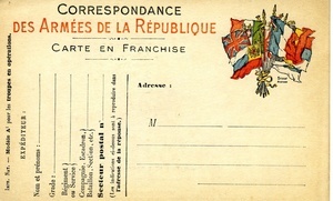 Ungelaufene offizielle französische Militärkorrespondenz-Postkarte mit vorgedruckten Feldern auf bräunlichem Papier, mehrfarbig. Bemerkenswert ist der Druck des Graveurs "Stern" in der oberen rechten Ecke der Vorderseite der Postkarte. Dargestellt sind die zu einem Bund zusammengebundenen Flaggen der Entente, sowie Japans, Belgiens, des Königreichs Montenegro, des Königreichs Serbien und Italiens.