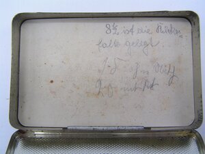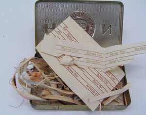 In einer Zigarettenschachtel aus Blech befinden sich handgeschriebene und gedruckte Inschriften, die für die Herstellung von Andenkenbildern vorgesehen sind und wie sie in der Devotionalienwerkstatt des Trierer Klosters St. Clara (1920-2018) gefertigt wurden. Acht handgeschriebene Inschriften bezeichnen die vier großen Aachener Heiligtümer: das Kleid der Mutter Gottes, die Windeln Jesu, das Lendentuch Jesu und das Enthauptungstuch des heilen Johannes des Täufers. Die vier "großen" Reliquien kamen unter Karl dem Großen (Regierungszeit 768-814, gekrönt in Aachen) aus Jerusalem nach Aachen. Sie werden alle 7 Jahre gezeigt, die Seidezwei, in der sie in der Zwischenzeit eingepackt sind, wird in Reliquienbildern und Kästen den Gläubigen zum Kauf angeboten. Die Farben der Seidentücher ist festgelegt: Weiß ist die Fabe der Mutter Gottes, Gelb die Farbe der Windeln, Rot die Farbe des Lendentuchs und Rosa ist die Farbe des Enthauptungstuches von Jnes. In dieser Schachtel sind Seidenstücke unterschiedlicher Größen in den Farben Weiß, Rot und Hellblau vorhanden. . Außerdem finden sich gedruckte und zwei handschriftliche Inschriften mit "Agnus Dei" (Lamm Gottes) in der Schachtel. Sechs sechseckige Schildchen aus Papier mit einer goldfarbenen Oberfläche - wohl das ursprüngliche in der Schachtel enthaltene Zigarettenpapier -, ein Stückchen verbogener Golddraht und eine kleine Stecknadel sind ebenfalls vorhanden. Das in der Dose liegende Papier ist wie folgt mit Bleistift beschriftet: "8 1/2 ist die Rücken-/falte gelegt / 18 ohne Naht / 20 mit Naht". Die Zigarrettendose aus galvanisiertem Blech stammt von dem Haus Neuerburg, sie enthielt 25 Zigaretten, wie der Rest einer Banderole auf der Unterseite angibt. Herkunft: Ehemaliges Kloster St. Clara, Petrisberg, Trier, 1920 - 2018