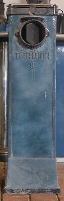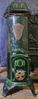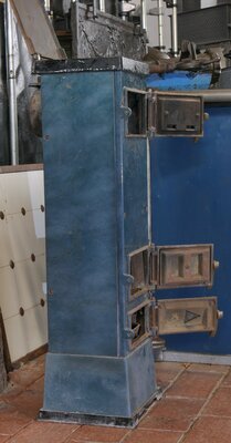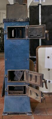 Kleiner, blau emaillierter Füllregulierofen. Die blaue Emaillierung an der Aussenseite ist fast vollständig intakt aber durch weisse Farbsprizer auf dieser gestört. Der Ofen steht auf einem Sockel und dieser steht auf 4 sehr niedrigen Füßen. An der Rückseite des Ofens befindet sich die Inschrift "THAUMA". Zusammen mit dem Ofen kam die Kohlenschütte HR 764 2022 in das Museum. Er ist im Inneren mit Schamotte ausgekleidet. Es existiert eine Türe zum Füllen des Ofens, eine Tür mit 2 Glimmerscheiben vor der Brennkammer und eine vor dem Aschekasten. Zwischen diesen befindet sich im Inneren ein Rost. Zur Regulierung das Luftzugs befindet sich an der Türe zum Aschkasten ein Schieber, an der Tür zum Einfüllen und am Abzug zum Schornstein je ein Drehregler. Oben befindet sich eine Platte zum Kochen, bzw. zum Warmhalten von Speisen. Der Ofen besitzt keine Dekoration. Mündlich überliefert ist, dass er in der Nachkriegszeit in München zum Heizen und als Kochgelegenheit für ein Studentenzimmer angeschafft wurde, und später 60 Jahre unbenutzt in einem Keller stand.