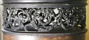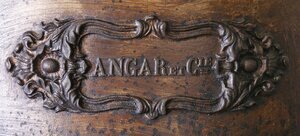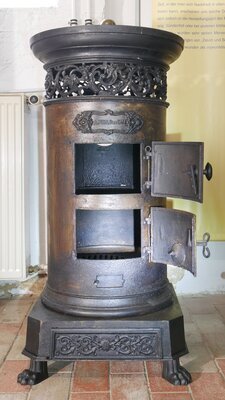 Aussenhülle eines auf Löwenpfoten stehender runder Regulierofens. Reguliermöglichkeit mit je einem Schieber an der Tür zur Feuerkammer und zwischen Feuerkammer und Aschekasten. Die mittlere Einheit zwischen Aschekastensocken und Aufbau ist mit brauner Farbe bemalt und soll Holz imitieren. Über der oberen Türen zur Brennkammer befeindet sich die Inschrift "ANGARetCie" innerhalb eines Schmuckelements. Wahrscheinllllich der Name des Herstellers.Die Brennkammer wird oben mit einer Platte die auch zum Kochen oder zum Erwämen von Bügeleisen verwendet werden kann begrenzt. Ganz oben befindet sich ein durchbrochener Rundfries mit auskragendem profiliertem Sims. Der Sockel beinhaltete den Aschekasten. Die mittlerweile festgelötete Schublatentür ist mit einem Schmuckelement versehen. Der Sockel steht auf 4 kleinen Löwenpfoten.