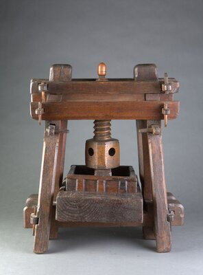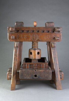 Miniaturkelter als gebrauchsfertiges Modell. Die Miniaturkelter ist vollständig ausgestattet mit Seckerbrettern, Hölzern und verstrebten Seitenpfosten. Die Querbalken sind zahnschnittartig geziert. Auf dem Kopfbalken findet sich die Hausmarke samt Jahresangabe. Miniaturkeltern wurden als Meisterstück zur Erlangung des Meistertitels angefertigt. Das Meisterstück soll eine Probe des Könnens sein und zeigen, dass die neue Meisterin oder der neue Meister das Handwerk im wahrsten Sinne des Wortes meisterlich beherrscht. Nun erfordert ein Meisterstück nicht nur einen hohen Zeitaufwand, sondern oft auch einen hohen finanziellen Einsatz. Allein der Holzpreis für ein großes Fass oder eine Weinpresse ist so hoch, dass sich in früheren Zeiten die Vereinigungen der Handwerker auch mit maßstabgerechten Modellen als Meisterstücken zufrieden gaben.