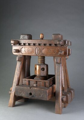 Miniaturkelter als gebrauchsfertiges Modell. Die Miniaturkelter ist vollständig ausgestattet mit Seckerbrettern, Hölzern und verstrebten Seitenpfosten. Die Querbalken sind zahnschnittartig geziert. Auf dem Kopfbalken findet sich die Hausmarke samt Jahresangabe. Miniaturkeltern wurden als Meisterstück zur Erlangung des Meistertitels angefertigt. Das Meisterstück soll eine Probe des Könnens sein und zeigen, dass die neue Meisterin oder der neue Meister das Handwerk im wahrsten Sinne des Wortes meisterlich beherrscht. Nun erfordert ein Meisterstück nicht nur einen hohen Zeitaufwand, sondern oft auch einen hohen finanziellen Einsatz. Allein der Holzpreis für ein großes Fass oder eine Weinpresse ist so hoch, dass sich in früheren Zeiten die Vereinigungen der Handwerker auch mit maßstabgerechten Modellen als Meisterstücken zufrieden gaben.