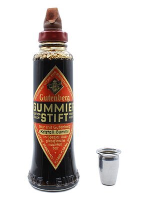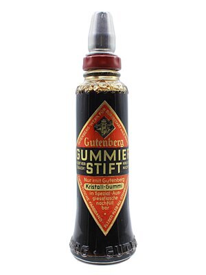 100ml Gutenberg Gummierstift in einer Glasflasche mit Aluminiumverschlusskappe; Flasche Original verschlossen und vollständig gefüllt; es handelt sich um einen umweltfreundliche Kleber für Büro und Haushalt, hergestellt aus Pflanzengummi/Gummiarabikum (Kristallgummi) auf Wasserbasis; hergestellt vom "Gutenberg Werk für Bürobedarf m.b.H." in Mainz; Teil eines Gutenberg-Werk-Musterkoffers aus den 1950er Jahren
