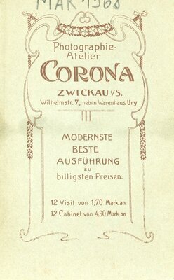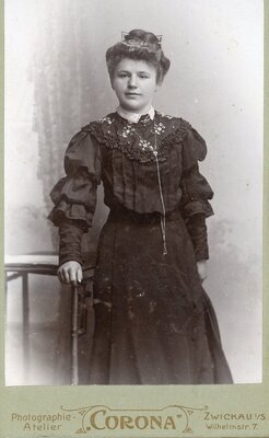 Das Mädchen steht an einem kleinen Tisch vor einer Studiobemalung, die rechte Hand liegt auf dem Rand des Tischchens. Es trägt ein langes dunkles Kleid mit in Falten gelegtem Oberteil und kleinem hellen Kragen. An den langen Ärmeln sind im oberen Bereich Volants, im Brustbereich Stickerei und Rüschenbesatz. Am Kragen trägt es eine kleine Anstecknadel und um den Hals eine lange dünne Kette. Die Haare sind locker nach oben zu einem Dutt frisiert. Auf der Rückseite das Emblem vom Photographie-Atelier Corona aus Zwickaui/S.
