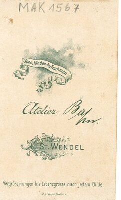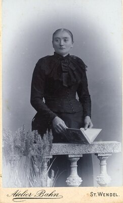 Die Frau steht hinter einer verzierten Studiobalustrade, davor zwei Büschel Gräser. Sie trägt ein 2-teiliges schwarzes Kleid mit langen Armen. Das etwa verlängerte Oberteil ist tailliert und an der Vorderseite geknöpft. Um die Schultern eine Art Pelerie aus schwarzer Spitze mit Schleife. Auf der Balustrade liegt ein aufgeschlagenes Buch das sie mit beiden Händen hält.Die glatten Haare sind streng nach hinten gekämmt und hochgesteckt. Auf der Rückseite das Emblem vom Atelier Bahn aus St. Wendel.
