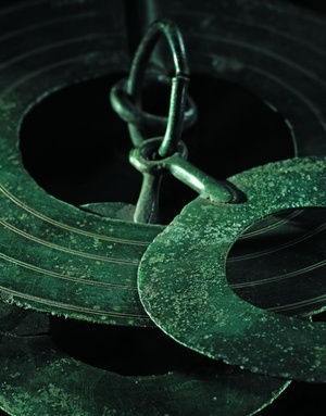 Die dunkelgrün patinierten gelochten Bronzeblechscheiben mit im Zirkelschlag eingeritzten konzentrischen Kreisen waren ursprünglich goldglänzend. Die größere Blechscheibe ist mit einem Befestigungsstab mit beidseitigen Ösen ausgestattet. Die äußere Öse diente der Aufhängung des Ensembles, während die innere Öse, vermittelt durch einen weiteren Ring, die beiden kleineren Bleche in ähnlicher Konstruktion frei beweglich eingehängt sind. Die Verwendung dieser Scheiben ist unsicher. Die häufigste Vermutung geht dahin, dass sie als Schmuck oder "Klapperbleche" von Pferden vor der Brust getragen wurden. Diese Vermutung stützt sich auf gelegentliche Funde solcher Bleche mit gesicherten Bestandteilen der Pferdeschirrung wie Trensen. Die Bronzebleche stammen aus einem Hortfund, also einer absichtsvollen Niederlegung in den Boden und datieren um 400 v. Chr.
