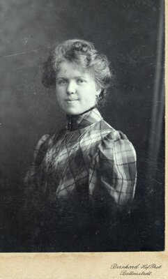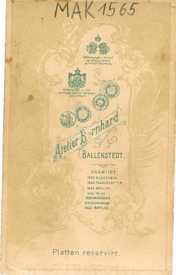 Die junge Frau tägt ein kariertes Oberteil mit großen Puffarmen und hohem Stehkragen. Der Brustbereich ist in kleine Falten gelegt. Die Haare sind locker nach hinten zusammen gesteckt. Sie trägt Ohrringe und schaut freundlich nach links gedreht in die Kamera. Der Hintergrund ist dunkel. Auf der Rückseite ist das Emblem des Ateliers Berhard aus Ballenstedt und Wappen von verschiedenen Auszeichnungen und Prämierungen zu sehen, außerdem der Hinweis daß die Platten reserviert bleiben.