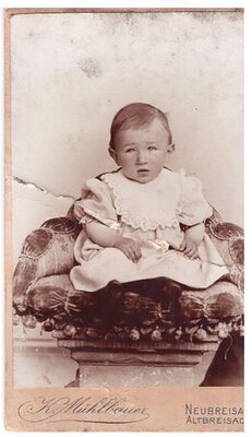 Zu sehen ist ein kleines Kind im Fotoatelier. Auf eine Art Säule hat man eine Art Sitz aus Plüsch und Polstermaterial gebaut. Darauf hat man das Kind gesetzt. Es trägt ein weißes Kleid, die Hände sind auf die Oberschenkel gelegt. Um den Hals trägt es einen Latz, der mit Spitze besetzt ist. Die Haare sind links gescheitelt, der Blick geht etwas ängstlich am Fotografen vorbei.