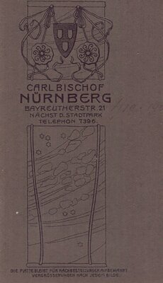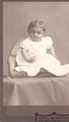 Zu sehen ist ein kleines Kind im Fotoatelier. Auf einem Tisch hat man einen Sitz gestellt und hier drin sitzt das Kind. Es trägt ein weißes Kleid (Taufkleid?). Ein Arm ruht auf der Sitzlehne, während der andere etwas nach hinten gedreht ist. Die Haare sind kurz und weisen an den Spitzen kleine Wirbel auf. Das Kind hält den Kopf leicht schief und schaut den Fotografen etwas neugierig an. Unter dem Bild sind der Name und der Sitz des Fotoateliers vermerkt.