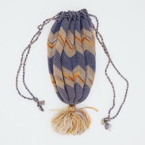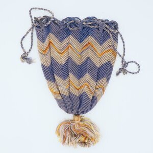 Der Beutel ist aus Garn in Blau, Beige und Orange in einem Zickzackmuster gehäkelt. Er ist nicht gefüttert und kann mitheilfe einer Kordel zugezogen werden. Unten wurde zur Dekoration eine schlichte Troddel angebracht.