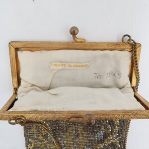 Hierbei handelt es sich um eine Abend/Partytasche aus den "Goldenen Zwanzigern". Diese Art von Tasche passt zur "Flapper"-Mode der Zeit, ein Name der sich auf die jungen progressiven Frauen des Nachtlebens bezieht. Sie ist aus kleinen Perlen in grau, blau und grün geknüpft und wird mit einem Metallverschluss in Gold verschlossen. Unten sind Fransen aus Perlen angebracht, ein sehr typisches Design-Element für diese Zeit. Tatsächlich wurden Fransen an Kleidern selten verwendet, sie sind aber oft an Handtaschen zu finden. Im ecru Futter ist ein "Made in France" Schild angenäht.