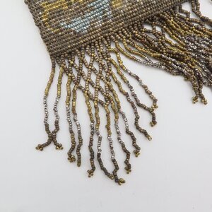 Hierbei handelt es sich um eine Abend/Partytasche aus den "Goldenen Zwanzigern". Diese Art von Tasche passt zur "Flapper"-Mode der Zeit, ein Name der sich auf die jungen progressiven Frauen des Nachtlebens bezieht. Sie ist aus kleinen Perlen in grau, blau und grün geknüpft und wird mit einem Metallverschluss in Gold verschlossen. Unten sind Fransen aus Perlen angebracht, ein sehr typisches Design-Element für diese Zeit. Tatsächlich wurden Fransen an Kleidern selten verwendet, sie sind aber oft an Handtaschen zu finden. Im ecru Futter ist ein "Made in France" Schild angenäht.