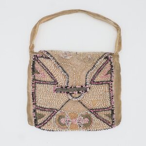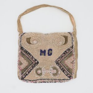 Das kleine Handtäschchen ist mit Ausnahme des Tragegriffs komplett mit Glasperlen in Pastellrosatönen bestickt. Es wurde vermutlich zu festlichen Anlässen oder Partys getragen. Der Obere Teil überlappt den Vorderteil und endet in einer Lasche, die zum Schließen durch den Stoffriegen geschoben wird. Hinten sind mit blauen Perlen die Initialen "MC" eingestickt. Innen ist die Tasche mit hellrosa Stoff gefüttert.