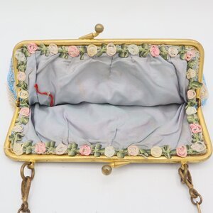 Es handelt sich hierbei um eine Perlenhandtasche aus dem frühen 20. Jahrhundert, vermutlich aus den 1920ern. Die Tasche ist komplett mit Perlen bedeckt, welche ein klassizistisches Blumenmotiv auf beige Grund formen. Das Motiv ist auf beiden Seiten gleich. Innen befindet sich ein hellblaues Seidenfutter, der Übergang zur goldenen Schließe ist mit einer Blumenborte verziert.
