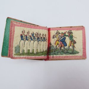 Dieses kleine Nadelbüchlein zeigt handkolorierte ländliche und militärische Szenen aus den 1830er-Jahren. Die Seiten sind in hellrosa Band von Hand eingefasst und lose mit einem magentafarbenen Band zusammengebunden. Die Titelseite ist mit einer goldfarbenen Metallborte eingerahmt.