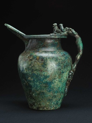 Ein nackter Jüngling dient als Henkel einer etruskischen Schnabelkanne. Auf dem Rand, wo er sich in die langen Haarsträhnen fasst, hocken zwei Löwen. Zu seinen Füßen befinden sich zwei Personen, eine mit erhobenem Schwert. Gefertigt wurde die Kanne in einer Werkstatt im etruskischen Mittelitalien, bestimmt für luxuriöse Gelage der Oberschicht. Die Kanne besteht aus drei Teilen, die ursprünglich nicht zusammengehören. Etruskischer Herkunft sind nur der gegossene Henkel und das in einem Stück getriebene Blechgefäß. Am Ansatz des Kannenausgusses erkennt man ein Nahtstelle. Ein keltischer Handwerker hat hier einen nachgeformten Ausguss angesetzt. Gefunden wurde die Kanne im reich ausgestatteten Prunkgrab eines keltischen Kriegers im Hunsrück und datiert um 400 v. Chr. Die Kanne gehört zur Sammlung der Gesellschaft für nützliche Forschungen Trier, die im Rheinischen Landesmuseum Trier aufbewahrt wird.
