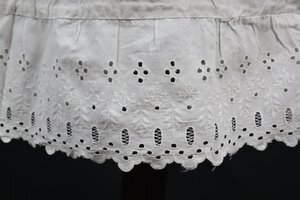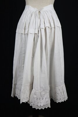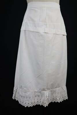 Schlichter Unterrock aus Baumwolle. Die einzige Dekoration ist eine Spitze mit Lochstickerei am Saum. Das meiste Volumen fokussiert sich im hinteren Bereich des Rocks wo der Rock in das Taillenband eingereiht wird. Etwas darunter verläuft eine horizontale Biese die vermutlich eingenäht wurde um den Rock zu kürzen. Diese Technik hat den Vorteil, dass die Kürzung ohne weiteres rückgängig gemacht werden kann.