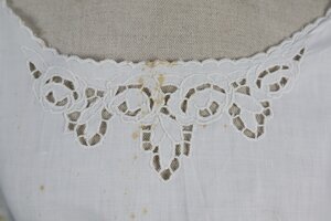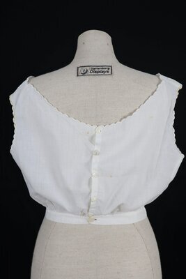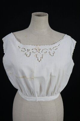 Diese Art Unterhemd wurde über Kosetts getragen. Das vorliegende Exemplar ist aus weißem Leinen gefertigt, Ausschnitt und Ärmel sind als Bogenkanten gestaltet. In der Mitte ziert eine Richelieustickerei das Vorderteil.