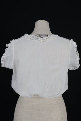 Weißes, aus Baumwollbatist gefertigtes Unterhemd. Der V-förmige Auschnitt und die Ärmelansätze sind mit Baumwollspitze umrahmt. Das Hemd schließt vorne mit einer verdeckten Knopfleiste.