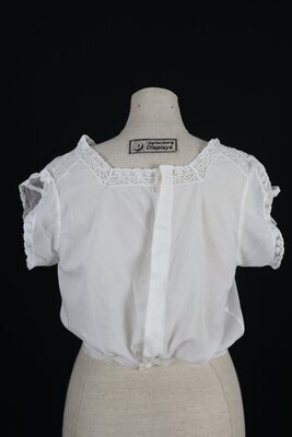Weißes, aus Baumwollbatist gefertigtes Unterhemd. Der eckige Auschnitt und die Ärmelansätze sind mit Baumwollspitze umrahmt, weitere Spitzeneinsätze zieren den Brustbereich. Das Hemd schließt hinten mit einer verdeckten Knopfleiste.