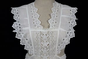 Elaborierte Schürze aus Baumwollorganza mit Richelieustickerei.