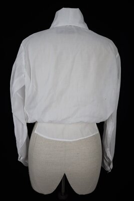 Schlichte Bluse aus Baumwolle mit weitem hohen Kragen. Innen befindet sich ein Schild mit der Aufschrift „46“. Was damals eine Größe 46 war entspricht in etwa einer 38 heute.