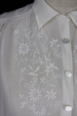 Weiße Bluse aus Crepe. Die Bluse hat kurze Ärmel mit Ärmelaufschlägen, sie kann vorne mittels einer Knopfleiste geschlossen werden. Der Brustbereich ist mit einem großen floralen Motiv bestickt, die Blütenblätter sind appliziert um das von feinen Stängeln umrankte Motiv hervorzuheben.