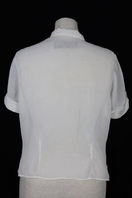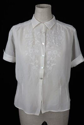 Weiße Bluse aus Crepe. Die Bluse hat kurze Ärmel mit Ärmelaufschlägen, sie kann vorne mittels einer Knopfleiste geschlossen werden. Der Brustbereich ist mit einem großen floralen Motiv bestickt, die Blütenblätter sind appliziert um das von feinen Stängeln umrankte Motiv hervorzuheben.