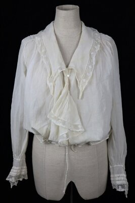 Diese cremefarbene Bluse ist aus feinem Baumwollbatist genäht. Sie hat einen V-Ausschnitt mit Kragen und ein Volant in Jabotoptik vorne am Verschluss. Die Kanten sind alle mit Spitze umrandet. Dank der eigezogenen Kordel ist der Taillenumfang sehr felxibel und kann an die Trägerin angepasst werden. Im Taillenbereich ist in blau das Initial "B" vermerkt.