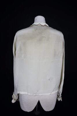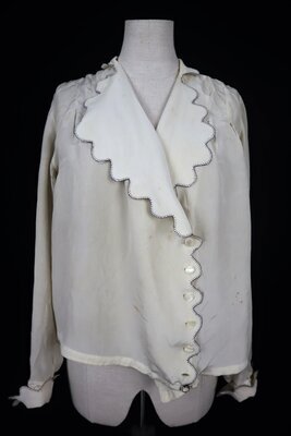 Diese Bluse wurde aus cremefarbemen Crepe gefertigt. Sie schließt vorne seitlich mit einer Reige Perlmuttknöpfe, die Kanten an Kragen und Knopfleiste sind als Bogenkanten von Hand mit Knopflochstich verarbeitet. An der Taille ist ein Haken angebracht. Laut Schild innen ist die Bluse eine Größe 46.