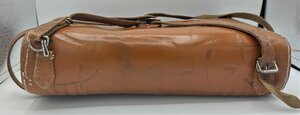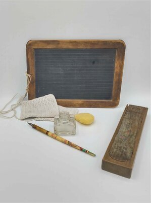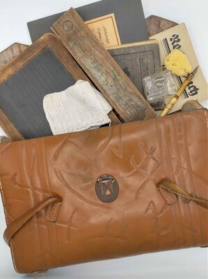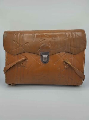 Die Schultasche, oder auch der Schulranzen ist aus hellbraunem Leder gefertigt und besitzt ein Muster aus geraden, senkrechten Linien und Strichen, welche keiner erkennbaren Richtung folgen. Vorne in der Mitte kann der Deckel an einer Schnalle festgemacht werden, die Träger sind an dem Boden der Tasche auf der einen Seite mit einer Schnalle befestigt und auf der anderen Seite kann der Träger einfach ein- und wieder ausgehängt werden. So ließ sich die Tasche leichter an- und wieder ausziehen. Besonders an dieser Tasche ist, dass die Träger nicht auf der Rückseite der Tasche festgemacht sind, sondern dort lediglich durch einen metallenen Ring gezogen sind und über den Deckel der Tasche hinaus gehen, wo sie auf der Vorderseite der Tasche, in Höhe der Deckelschnalle rechts und links festgenäht sind. Das bedeutet, dass die Träger, erst immer nach rechts und links vom Deckel heruntergenommen werden mussten, damit der Deckel geöffnet werden konnte. Der Innenraum der Schultasche besteht aus einem einzigen Fach und ist gut gefüllt. Griffeldose und Schiefertafel mit dem dazugehörigen Schwämmchen sind vorhanden, aber auch ein leeres Tintenfass, ein Federhalter mit Metallfeder und ein Schulheft, sowie ein Rechenbuch und das Liederbuch "Der Zupfgeigenhansl". Es sind keinerlei Prägungen oder Ähnliches vorhanden, was Aufschluss über den Hersteller geben könnte.