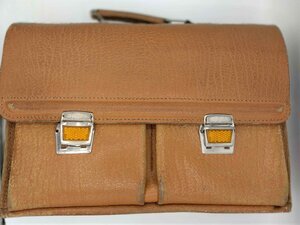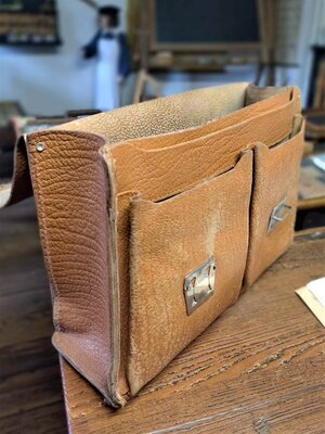 Die Schultasche, oder auch der Schulranzen ist aus hellbraunem Leder gefertigt. Sie besaß vorne ursprünglich zwei Schnapp-Schnallen, die mit eckigen gelben Reflektoren kombiniert waren und an denen der Deckel der Tasche festgemacht werden konnte, davon ist jedoch eine kaputt, so dass der Deckel nur noch an einer Seite mit der Schnalle befestigt werden kann. Die Tasche besitzt keine Träger sondern lediglich einen Griff oben am Deckel. So ist davon auszugehen, dass diese Tasche nicht auf dem Rücken getragen werden sollte, sondern vermutlich eher die Tasche einer Lehrkraft war. Sie ist auch deutlich größer als die regulären Schultaschen dieser Zeit. Der Innenraum der Schultasche besteht aus einem großen Fach, besitzt aber auch eine schmale Tasche an der Vorderseite, in die Hefte oder ähnliche dünne Materialien transportiert werden konnten. Des Weiteren besitzt sie auf ihrer Vorderseite zwei weitere angenähte Taschen. Es sind keinerlei Prägungen oder Ähnliches vorhanden, was Aufschluss über den Hersteller geben könnte.