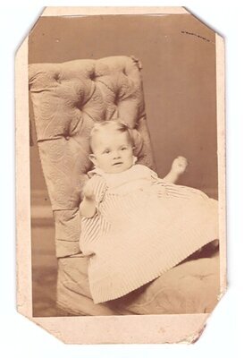 Zu sehen ist ein Kleinkind in einem gestreiften Kleid. Es sitzt euf einem Stuhl, den man mit Polster und Stoff überzogen hat. Die Arme sind angehoben und es hat den Anschein, dass es diese während der Aufnahme bewegt hat. Der Gesichtsausdruck ist entspannt und es sieht den Fotografen direkt an.