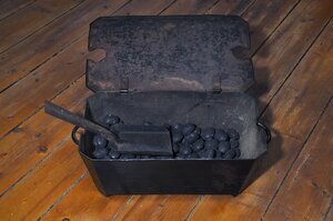 Kohlenbecken aus Holz mit Deckel und Metallgriff und Kohlenschaufen