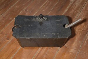 Kohlenbecken aus Holz mit Deckel und Metallgriff und Kohlenschaufen