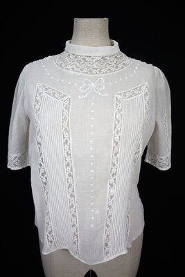 Weiße Bluse aus feiner Baumwolle. Im Bereich des Schlüsselbeins ist eine Schleife aufgestickt, darunter befindet sich eine Reihe aufgestickter Punkte die wie eine Knopfleiste wirken. Seitlich am Vorderteil befinden sich 2 mit Biesen strukturierte Teile, die von Spitzeneinsätzen eingerahmt sind. Der Bereich unterhalb des Kragens besteht aus aneinander genähten Spitzenbändern. Es ist möglich, dass die Bluse ursprünglich an der Taille eingereiht war und dies später aufgetrennt wurde um sie an den neueren Stil anzupassen. Hinten schließt sie mit einer Knopfleiste aus Perlmuttknöpfen.