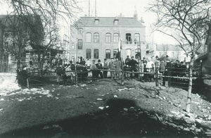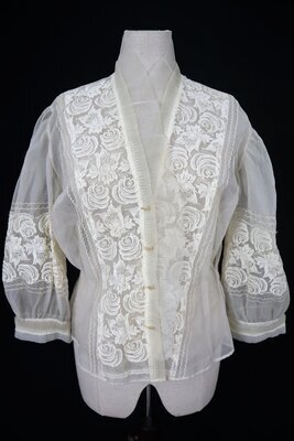 Transparente Bluse aus creme Organza. Das Vorderteil und die Ärmel sind maschinell in einem floralen Muster bestickt worden. Den vorderen Ausschnitt und den Ärmelsaum zieren eine mehrlagige plissierte Borte. Laut Schild in der rechten Innennaht handelt es sich um eine Größe 41.