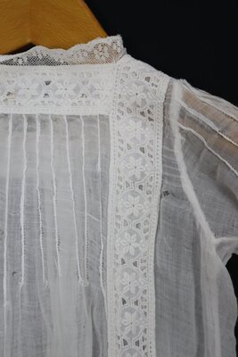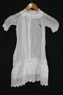 Dieses weiße Kleid aus feinem Baumwollbatist ist sehr wahrscheinlich ein Taufkleid. Es wird dekoriert duch Biesen, Lochspitze und eine Rüsche aus Leinen mit Lochstickerei am Saum. Die tiefgelegte Taille und bewusste Asymmetrie reflektiert die Trends der Zeit der Zeit.